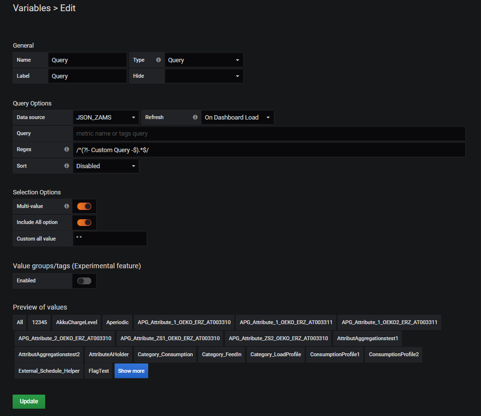 - Multi-Value: if several time series are to be selected simultaneously: yes (Attention, multiple selection variables require with JSON Datasource 0.1.7 the HAKOM.Config entry "UseJsonDataSourceQueryFix" = true being enabled, otherwise the interface cannot process the request)