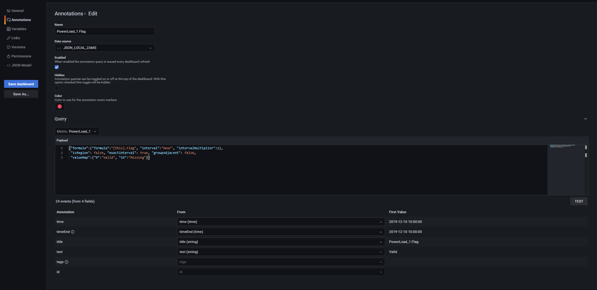 XML{"valueMap":{"1":"Mapping Text", "2":"Mapping Text 2"}}Retreive time series values of an ad hoc formula and mapped values to specific text (e.g. to display flags as annotation colours)