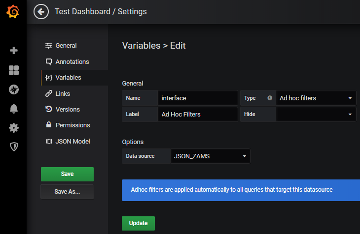 To use tags and ad hoc filters in Grafana, a Grafana variable of the type "Ad hoc filters" must be defined (for each data source). This can be done in the Dashboard Settings - Variables: