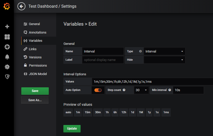 Additionally, the option "auto" can be added (as shown above). This corresponds somewhat restricted to the "Auto Option" of the Interval variable, i.e. if this is selected, the interval suggested by Grafana depending on the selected period is used.