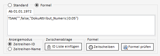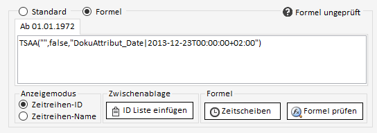 Sollen die Daten einer Zeitreihe anstatt über direkt gespeicherte Daten stattdessen über Formeln definiert werden, muss im Bearbeiten-Reiter umgeschaltet werden von "Standard" auf "Formel". Hier kann nun die Formel eingegeben & geprüft werden.