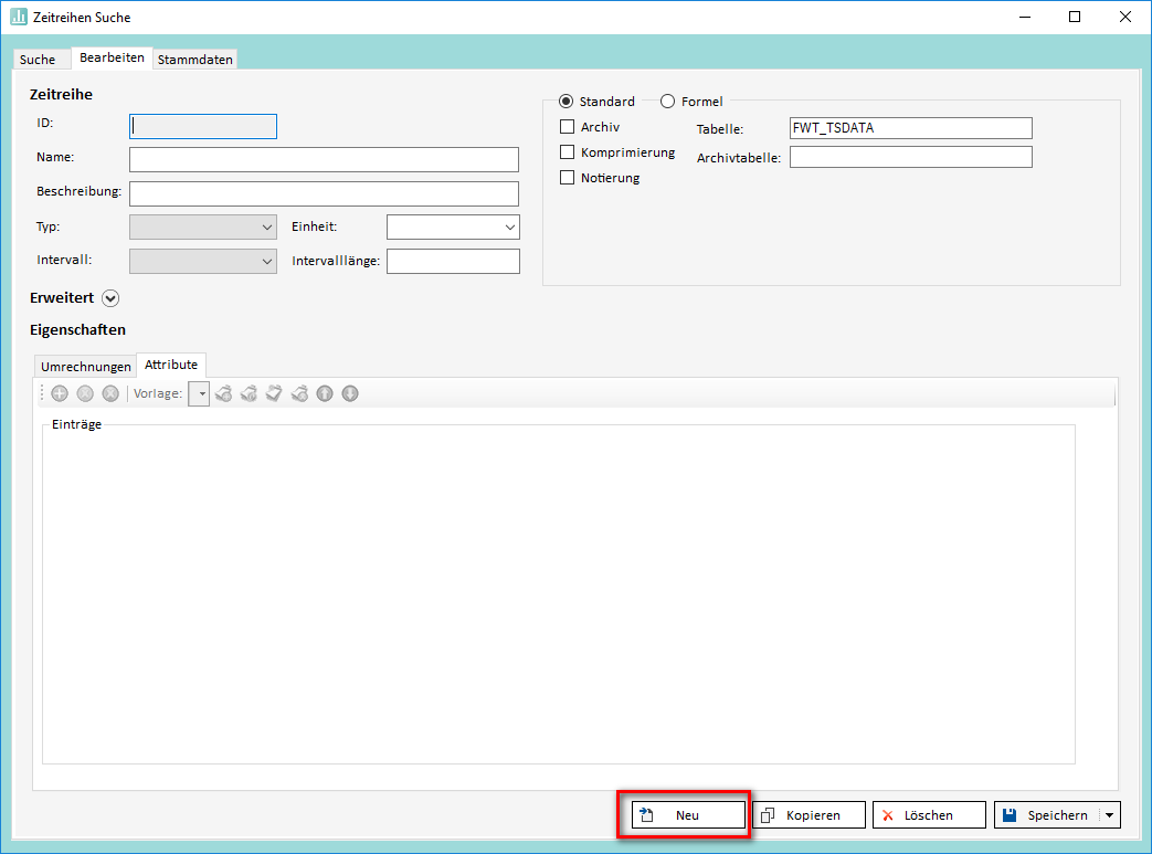 Zum Anlegen neuer Zeitreihen wird zuerst die Zeitreihensuche geöffnet. Im Reiter "Bearbeiten" können Zeitreihen bearbeitet und angelegt werden. Wurde zuvor eine Zeitreihe in der Suche ausgewählt ist das Formular bereits mit der Definition dieser Zeitreihe befüllt. In diesem Fall muss durch Klick auf den Button "Neu" unten rechts das Formular geleert bzw. auf Standardwerte zurückgesetzt werden.