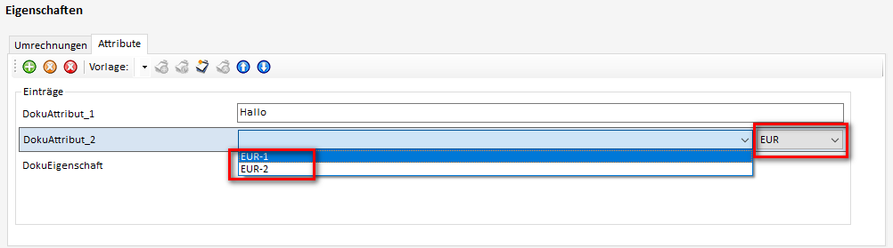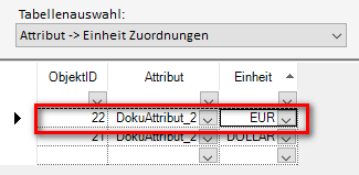 Dem Attribut „DokuAttribut_2“ wird die Einheit „EUR“ zugewiesen: