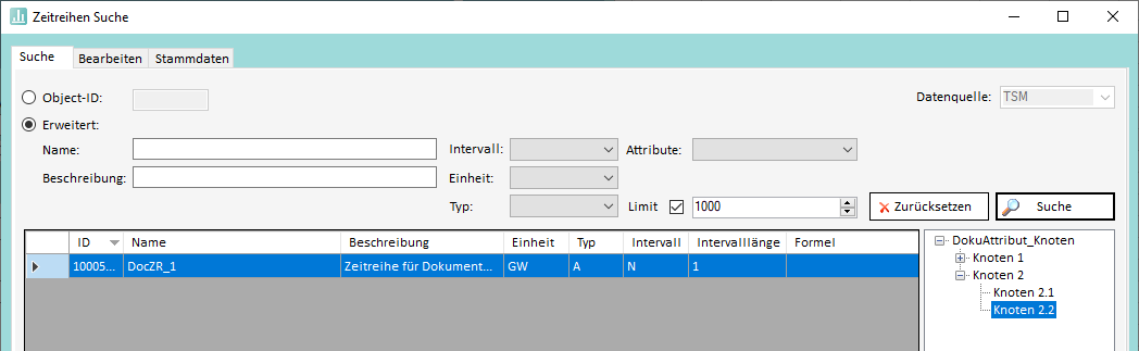 Die Systemattribute können im Bearbeiten-Tab der Zeitreihen Suche im Bereich "Erweitert" eingestellt werden: