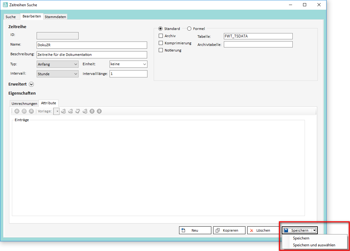 Hat man alle Einstellungen getroffen ist es an der Zeit die Zeitreihe zu speichern. Dies geht entweder durch einen Klick direkt auf den "Speichern"-Button oder durch Klick auf den kleinen Pfeil neben diesem Button (siehe Darstellung unterhalb). Dadurch wird ein Menü geöffnet, über das man zwei Möglichkeiten wählen kann: