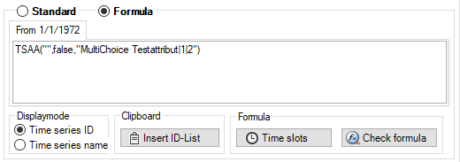 Replacing part of the search string with a wildcard also works. For example, the following formula "TSAA("",false, "MultiChoice Testattribut|%Upper Austria%")" yields an aggregate of all time series to which "Upper Austria" and possibly other values have been assigned (e.g.: "Lower Austria|Upper Austria", "Upper Austria| Vienna", etc.).