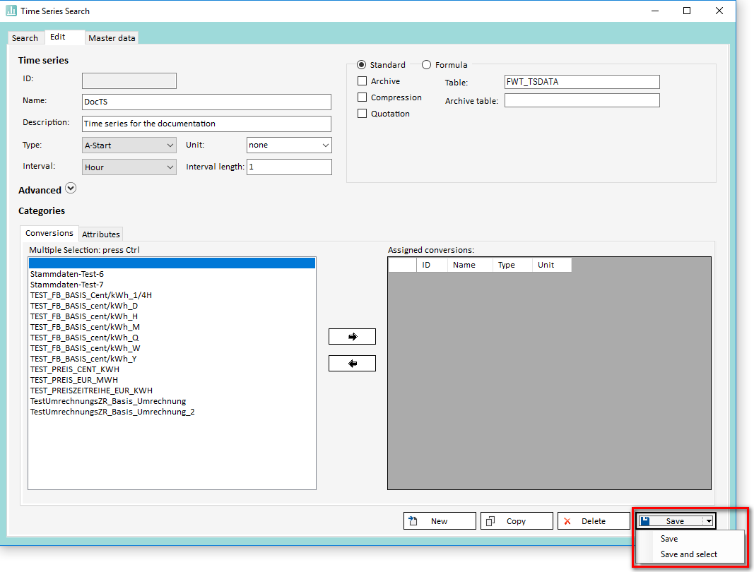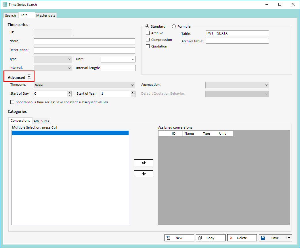 In order to create a new time series, first open the time series search window, then switch over to the "Edit" tab. If a time series was selected on the search tab, its data will be filled into the form. You can clear the form for a new time series by clicking on "New":
