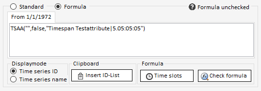 This datatype represents a timespan. When assigning an attribute of this type to a time series the timespan can be set directly via buttons. In a formula or in an Excel sheet for a Master data import the value of the attribute is set like this: