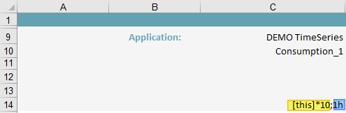 [MyTimeSeries] --> Referenced to "MyTimeSeries [MyTimeSeries,10] --> Referenced to "MyTimeSeries" loads 10 interval steps from the future in addition to the desired time range [MyTimeSeries,0,KWh] --> Load "MyTimeSeries" in unit "KWh [MyTimeSeries,0,KWh,Average] --> Load "MyTimeSeries" in unit "KWh", aggregated with the rule "Average" (instead of "Sum")