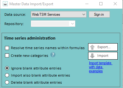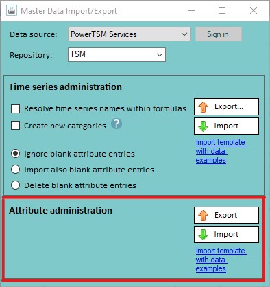 Similar to the time series import and export, attributes can be imported to and exported from all data sources using a template via the "Master Data Import/Export" plug-in.