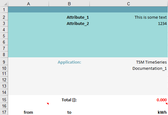 | 15 | This row contains the checksum. It is recalculated with each reading process depending on the grid and unit. If there is a formula in the totals line of the template (e.g. : " =SUM( A18:A96)" ), this formula will not be overwritten by the Time Series Manager. How the checksum is calculated depends on the aggregation method chosen for it. This method, in turn, can be determined in different ways (the higher the ranking in this list, the higher the priority):