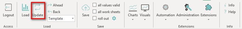 The latest version of a time series can quickly be loaded, by clicking on “Update”. This will update the current Excel Workbook with data from the data base. For this purpose, it is required that all parameters exist in the template. It is decisive for the processing of all components that the checksum row (Row 15), at which the TSM is determining the number of components, is throughout filled.