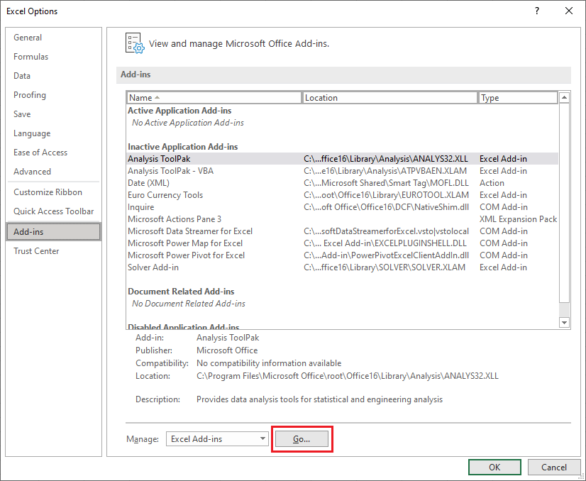 Select "Add-Ins" on the left in the Excel Options window and then "Go..." in "Manage - Excel Add-Ins".