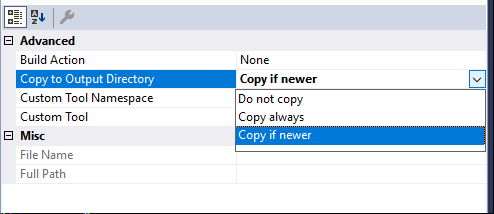 For each file the option "Copy to Output Directory" "Copy if newer" has to be configured.