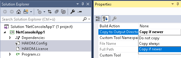 A textfile called "HAKOM.Config" as well as a valid "HAKOM.License" file has to be added to the project and copied into the output folder during compilation.