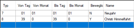 Beweglich | Tragen Sie hier "Y" für eine bewegliche und "N" für eine unbewegliche Periode ein. Unbewegliche Perioden sind fixiert mit den Werten der vorigen Spalten. So ist zum Beispiel Neujahr in der unteren Grafik fixiert auf den 01.01. des Jahres. Bewegliche Feiertage werden relativ zu Ostersonntag bestimmt. In der unteren Grafik ist Christi Himmelfahrt also 39 Tage nach Ostersonntag.