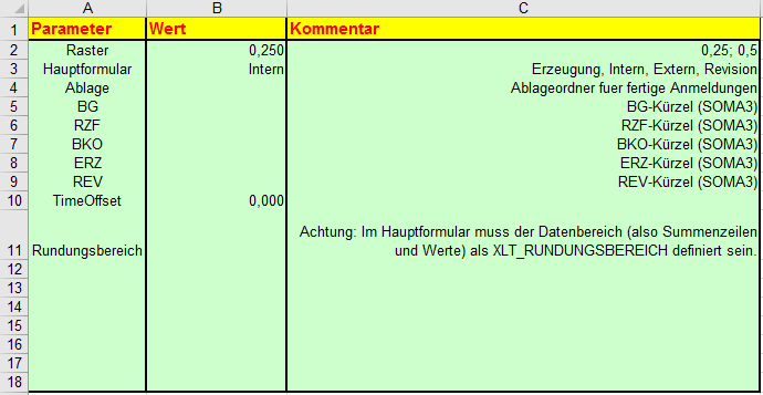 Voraussetzung dafür sind die Blätter „Parameter“ und „Info“ in der Arbeitsmappe.