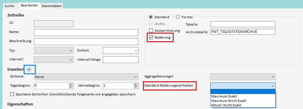 Außerdem kann nach Aktivierung der "Notierung" Checkbox ein Standard Notierungsverhalten für die Zeitreihe ausgewählt werden: