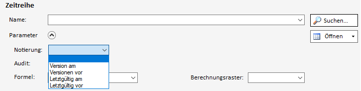 Über das Drop-Down Notierung können Version am, Versionen vor, Letztgültig am und Letztgültig vor ausgewählt werden.