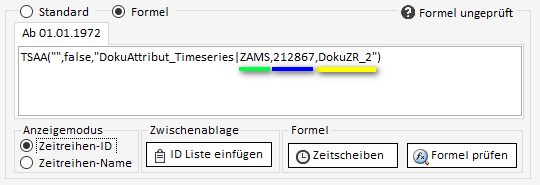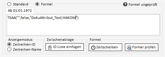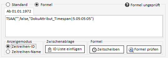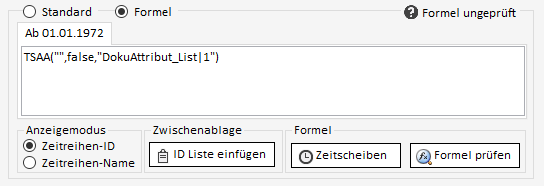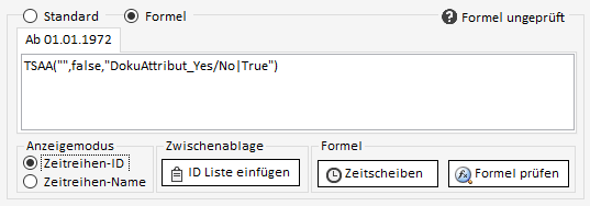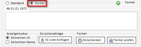 Sollen die Daten einer Zeitreihe anstatt über direkt gespeicherte Daten stattdessen über Formeln definiert werden, muss im Bearbeiten-Reiter umgeschaltet werden von "Standard" auf "Formel". Hier kann nun die Formel eingegeben & geprüft werden.