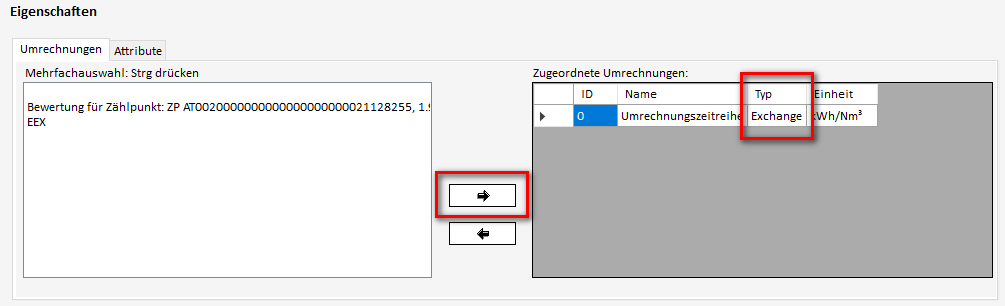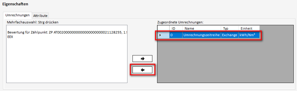 Dazu wird eine Umrechnungszeitreihe aus der Liste ausgewählt und mit dem "Pfeil-rechts" Button in die Liste der zugeordneten Eigenschaften hinzugefügt.