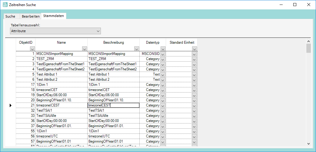 Über die Attributs-Verwaltung im Stammdaten-Tab der Zeitreihensuche können Attribute, Einheiten und Auswahllisten definiert werden: