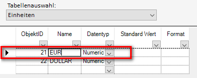 Hier wird die Einheit „EUR“ mit dem Datentyp „Numeric“ erstellt: