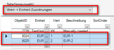 Anschließend werden der Einheit „EUR“ Werte, die zur Auswahl stehen sollen, zugewiesen: