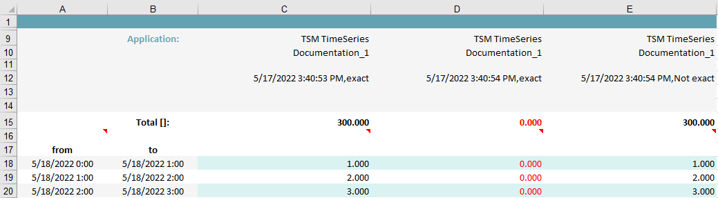 - In column C you can see that on this time series on 7/7/20 at 11:38:53 AM the data in the rows below were saved. This can be recognized by the "exact" option.
