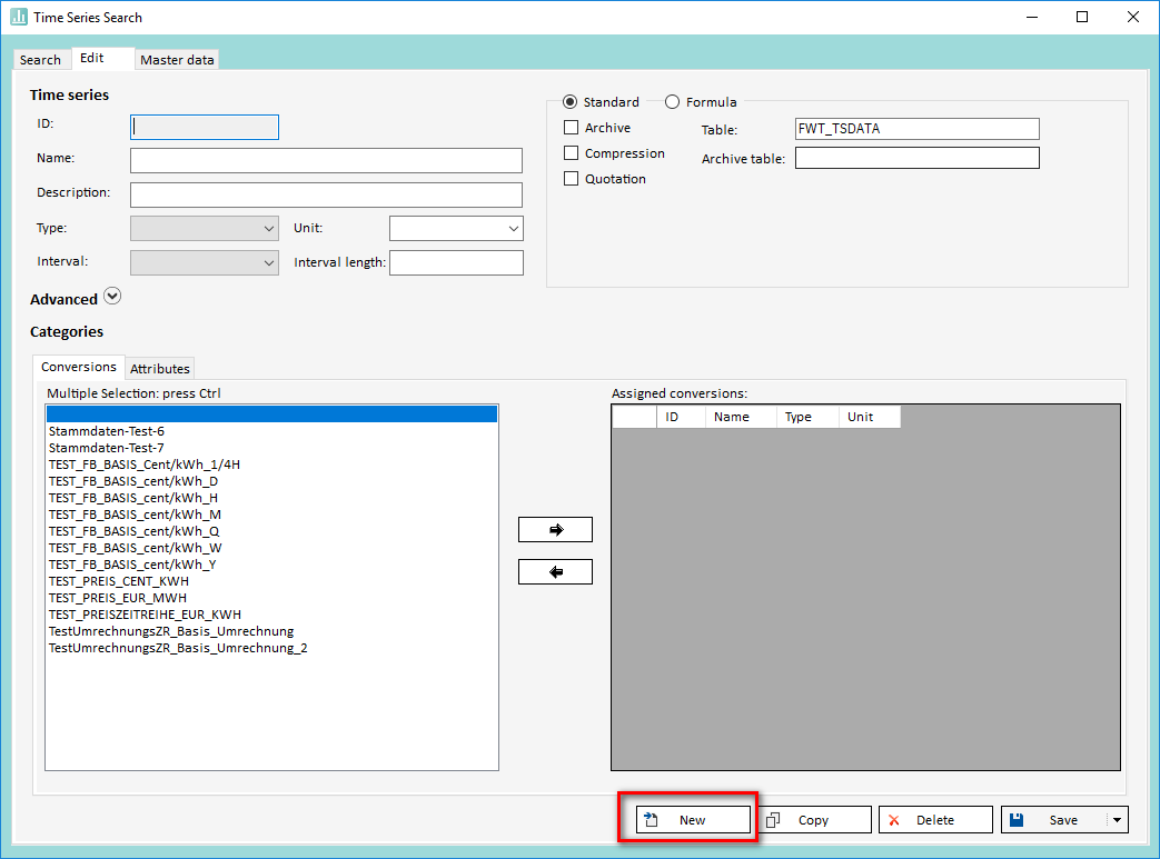 In order to create a new time series, first open the time series search window, then switch over to the "Edit" tab. If a time series was selected on the search tab, its data will be filled into the form. You can clear the form for a new time series by clicking on "New":