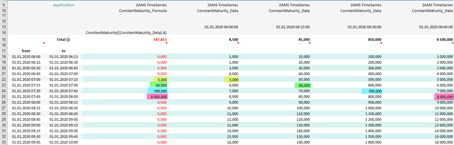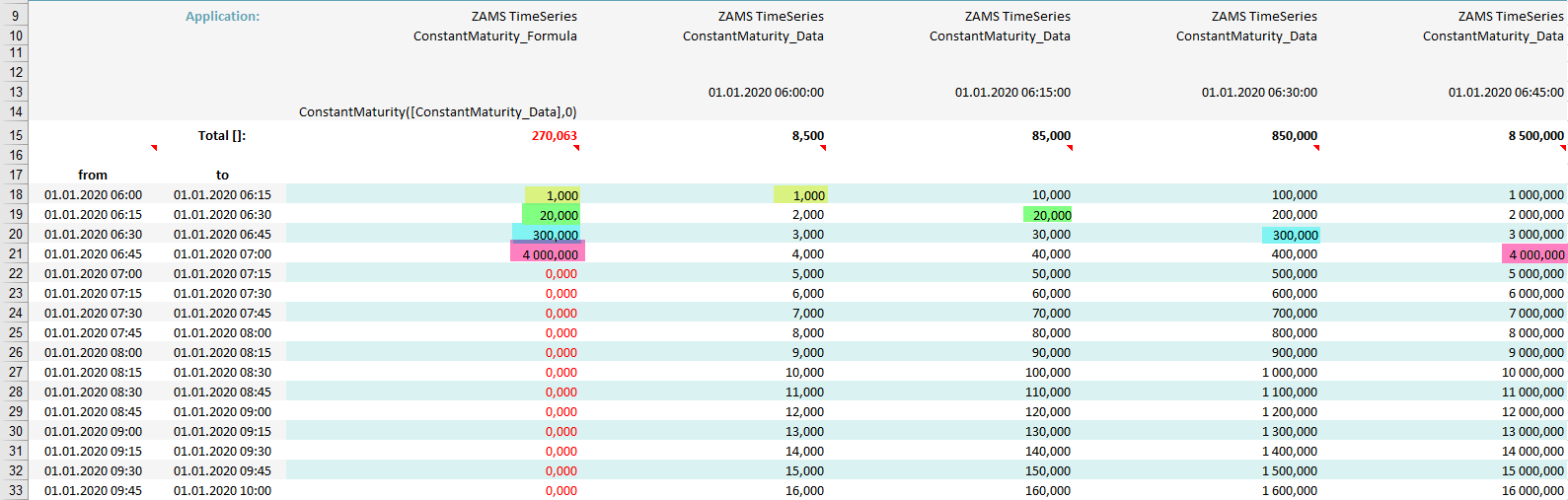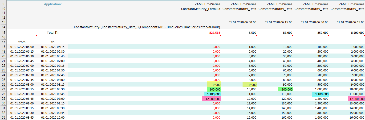 In this example the function was given an additional parameter - an interval (Components2016.TimeSeries.TimeSeriesInterval.Hour). Now maturity has the value 2 and the interval is hour. Again the values are taken from the version that fits the actual periods starting time, but this time they are shifted by two hours.