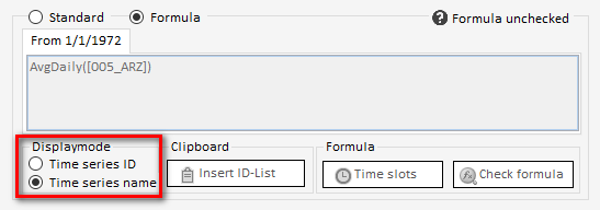 If the name of a time series is entered into the formula editor, it will be automatically changed to that time series ID. This guarantees that no unwanted side effects occur should this time series be renamed. By choosing the displaymode "Time series name" it is possible to display the name rather than the ID. In this mode it is not possible to make changes to the formula.