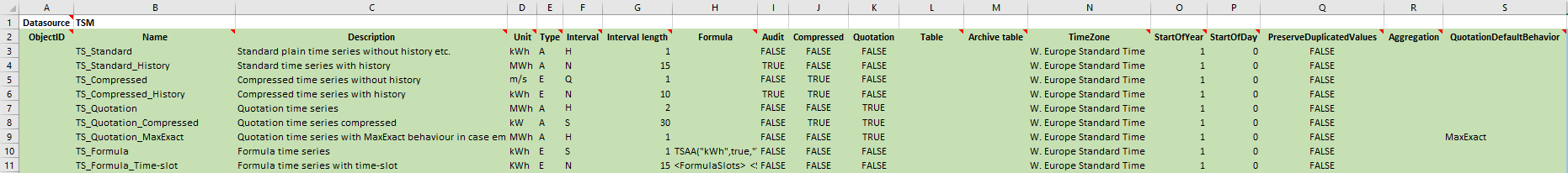 After a “Time Series Master Data Export” like described above, the time series categories which have been read to Excel can be edited.