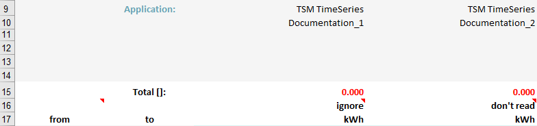 | 15 | This row contains the checksum. It is recalculated with each reading process depending on the grid and unit. If there is a formula in the totals line of the template (e.g. : " =SUM( A18:A96)" ), this formula will not be overwritten by the Time Series Manager. How the checksum is calculated depends on the aggregation method chosen for it. This method, in turn, can be determined in different ways (the higher the ranking in this list, the higher the priority):