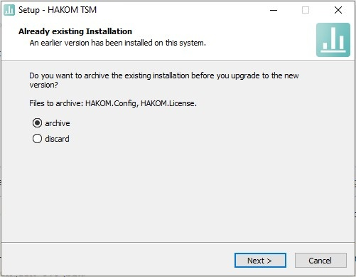If a previous version of HAKOM TSM App exists, you will be asked if the HAKOM.Config and HAKOM.License should be archived.