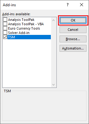 Back in the "Add-Ins" window, you can see that TSM is activated. Confirm it with "OK".