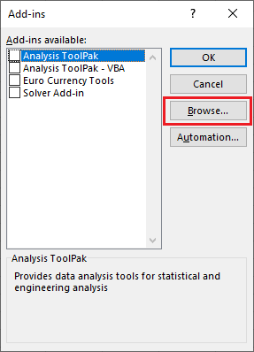On the add-ins page select the button "Browse" and then in the file selection dialog select the file HAKOM.TSM_64Bit.xll or HAKOM.TSM_32Bit.xll corresponding to the Excel version.