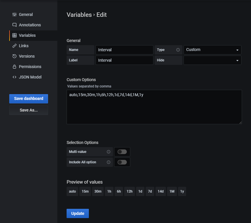 For this, a Grafana variable of type "Custom" with the name "Interval" (or with the name specified in HAKOM.Config "IntervalVariableName") must be defined. If another text is to be displayed instead of "Interval", this can be achieved with the help of the "Label" field: